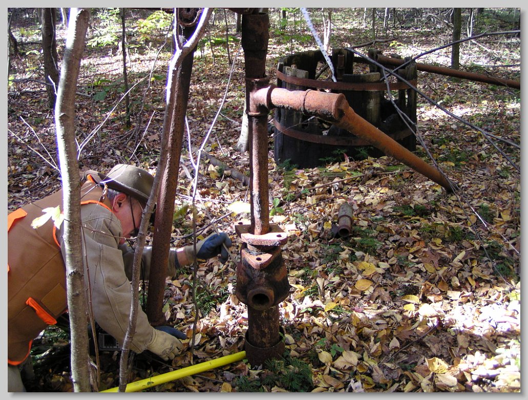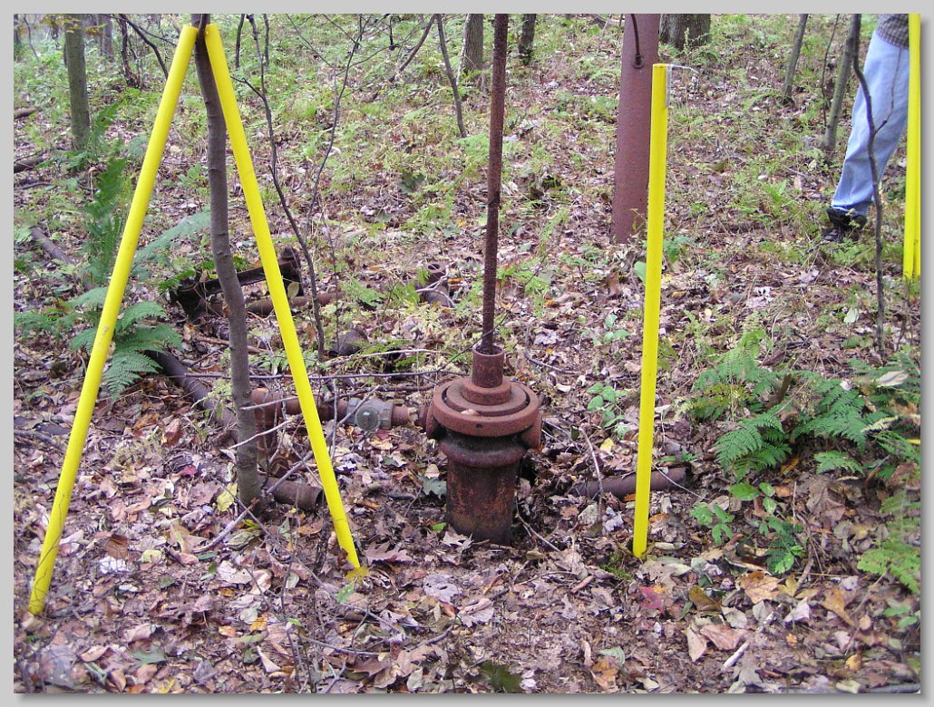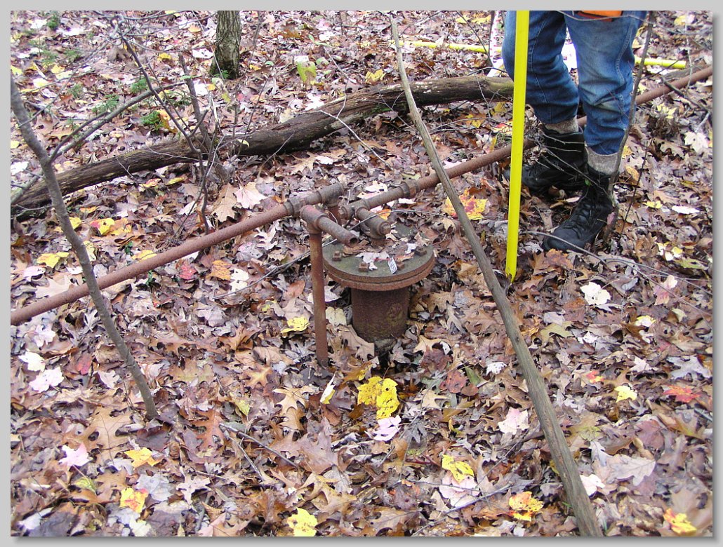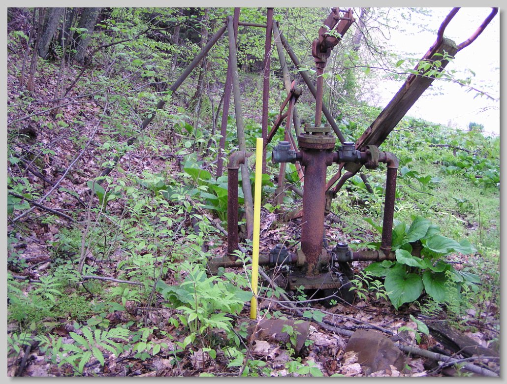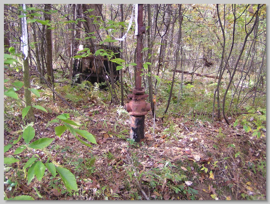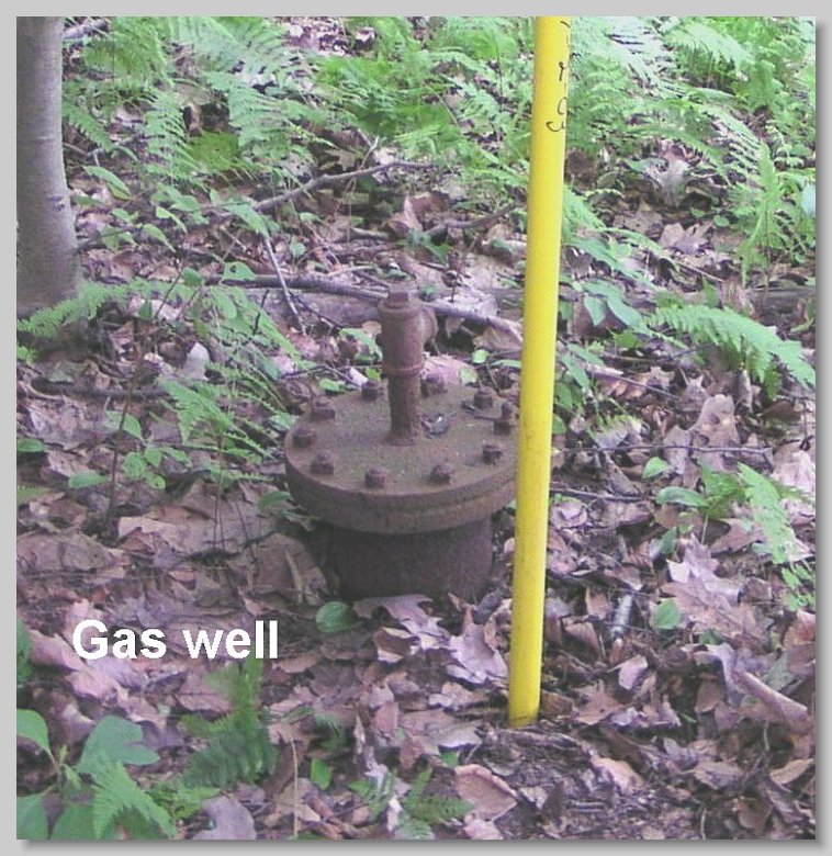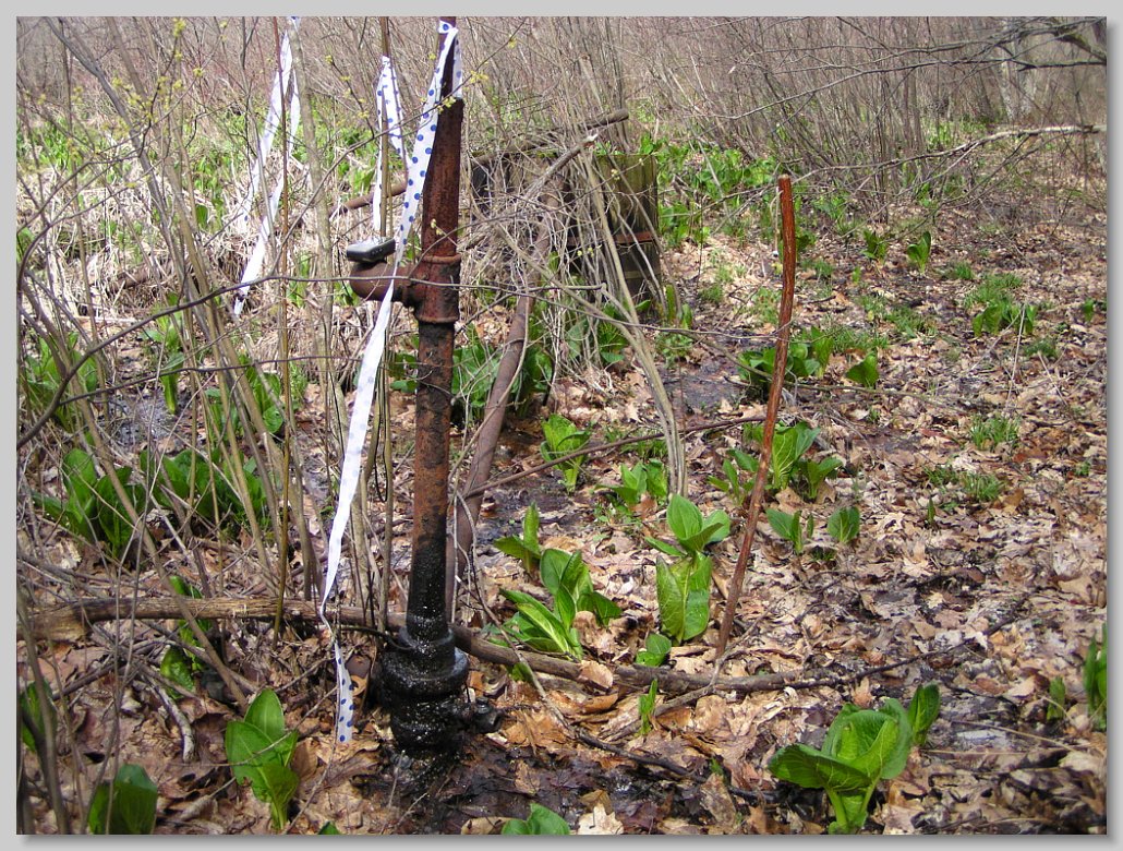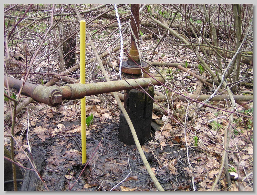 Large depression with no vegetation. An indication that gas and oil are leaking from well.