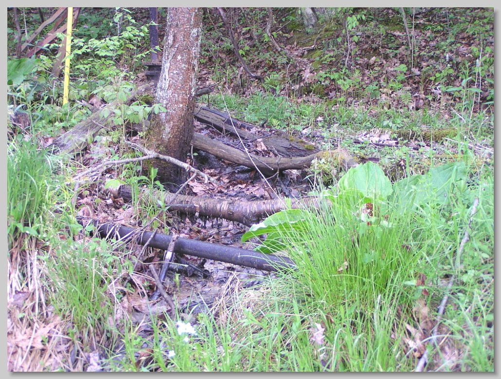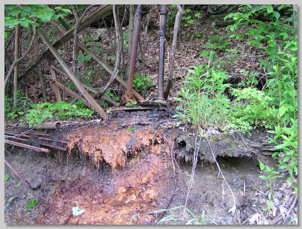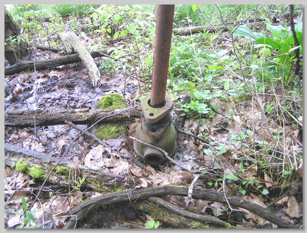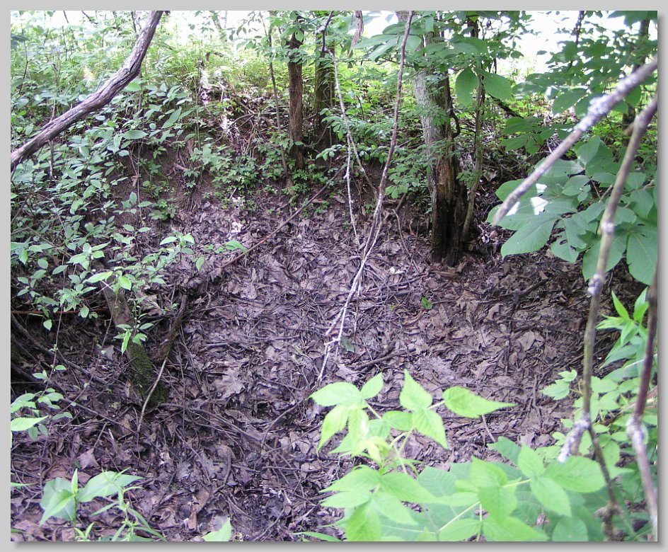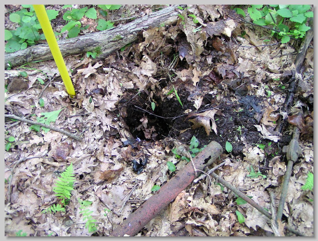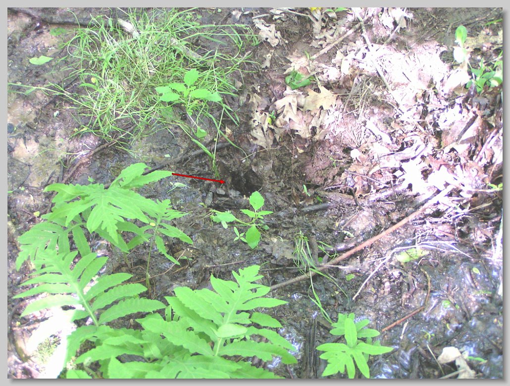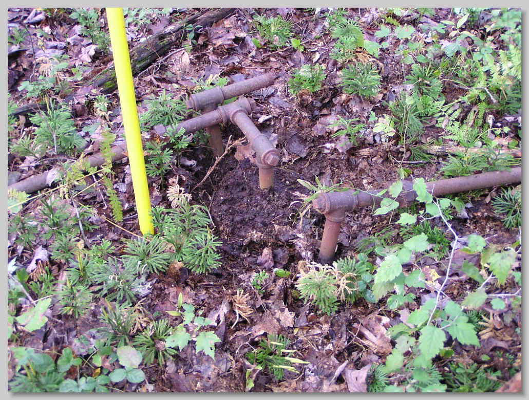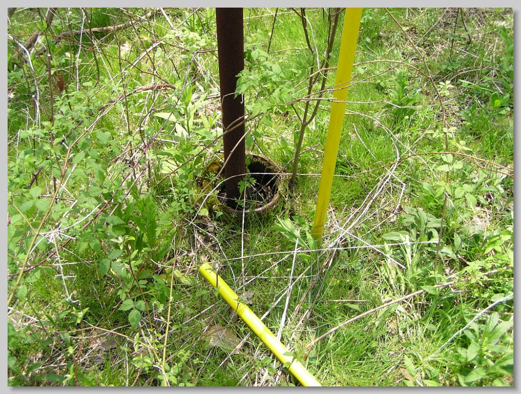 Large depression with no vegetation. An indication that gas and oil are leaking from well.