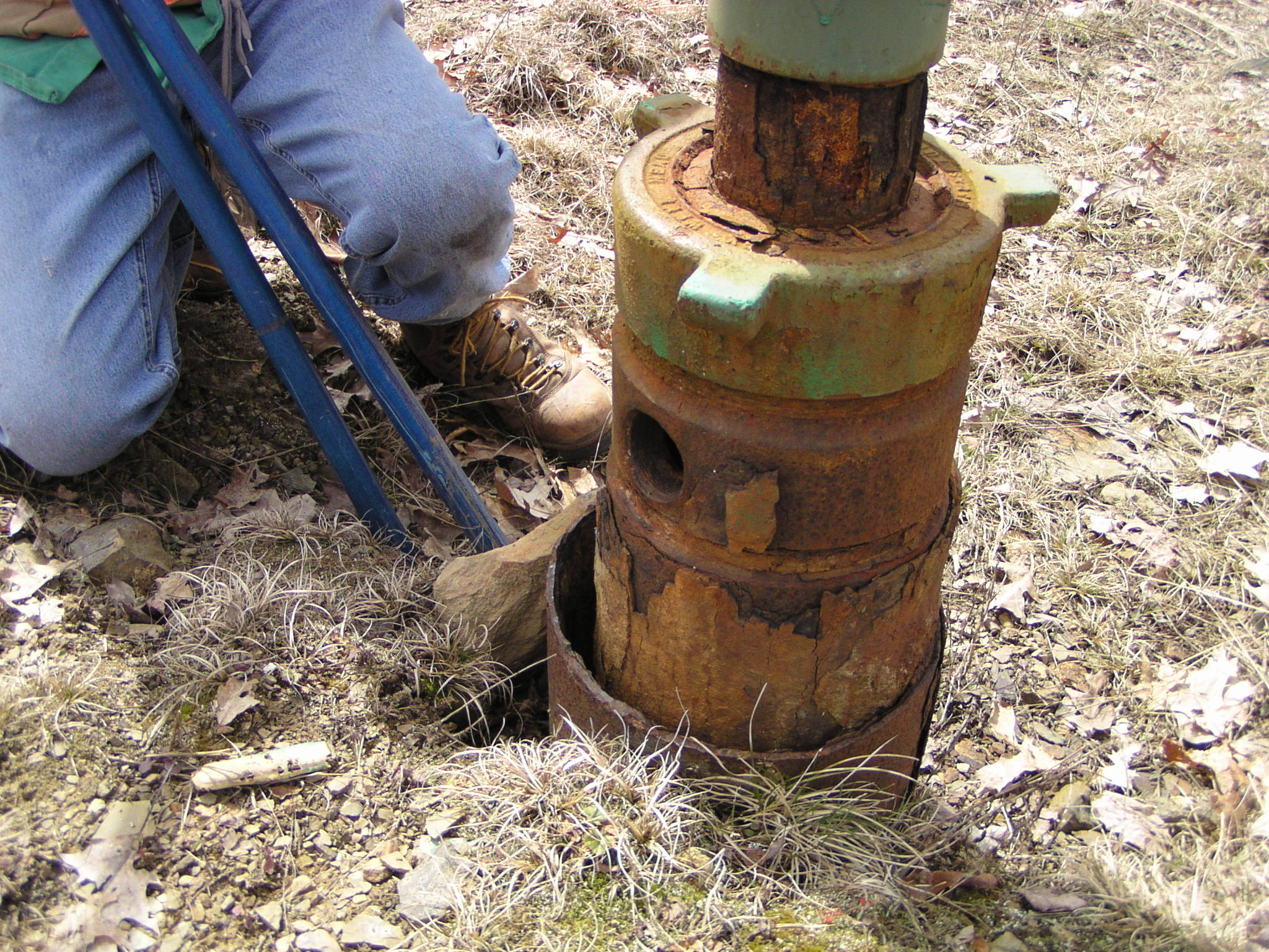 This is an example of both the construction and production casing of a Medina gas well. The sister well about 1/4 mile away already has a patch on the production casing. As the casing rusts through gas begins to leak from the well.