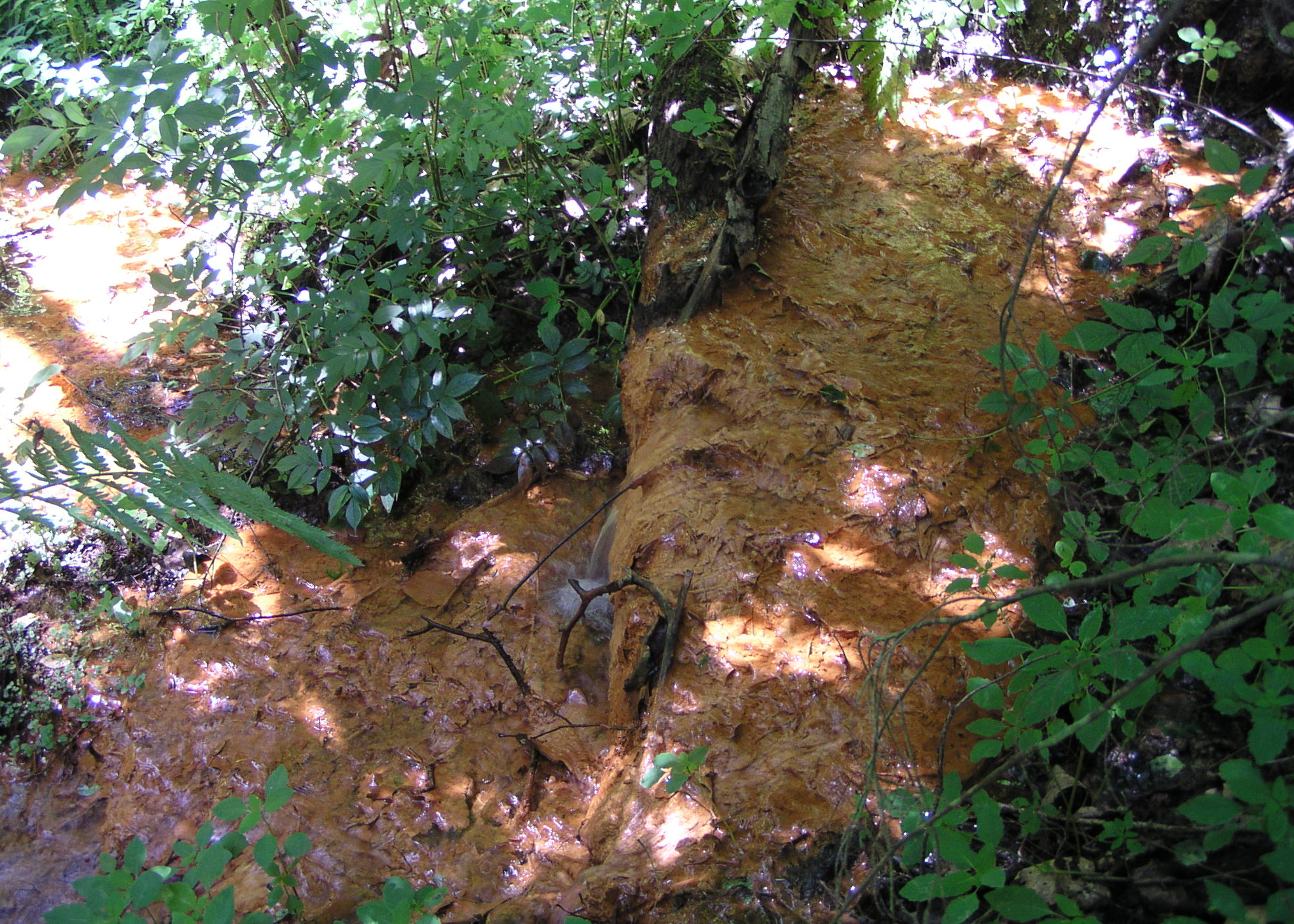 Although this iron seep may look harmful to the stream, chemical tests done 100 feet downstream from the seep indicate minimal levels of iron. The iron appears to oxidize as soon as it comes into contact with the air and precipitates out of the water.